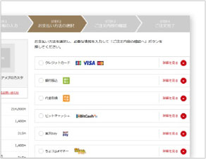 お支払い方法はクレジットカード、銀行振込、各種電子マネー(楽天Edy、ビットキャッシュ、ちょコムeマネー)に加えて、代金引換にも対応しています。※1