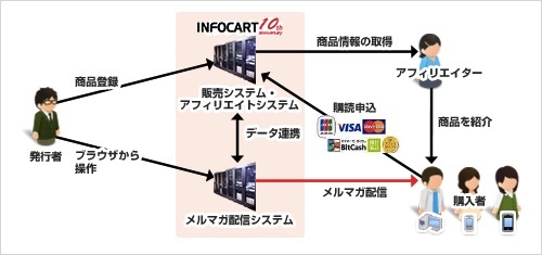 インフォカートの有料メルマガサービスは、読者の獲得から配信、顧客管理までワンストップで提供。有料メルマガ商品を1つ登録するだけでアフィリエイトシステム・決済システム・メルマガ配信システムをその場で手にできます。 あなたは購読料の回収や顧客管理といった雑務から解放され、本来の業務であるメルマガの執筆に集中できるようになります。
