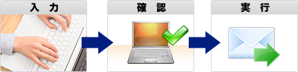 メルマガ配信は入力、確認、実行の3ステップで操作できます。 厳選した機能を適所に配置していますので、スムーズに操作できま す。